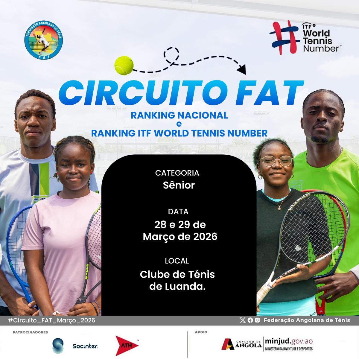 A Federação Angolana de Ténis, no âmbito do cumprimento do seu calendário oficial de competições, tem agendada, para os dias 28 e 29 de Março de 2026, a realização do Circuito FAT na categoria Sénior (Masculino e Feminino), em Luanda, nas instalações do Clube de Ténis de Luanda.